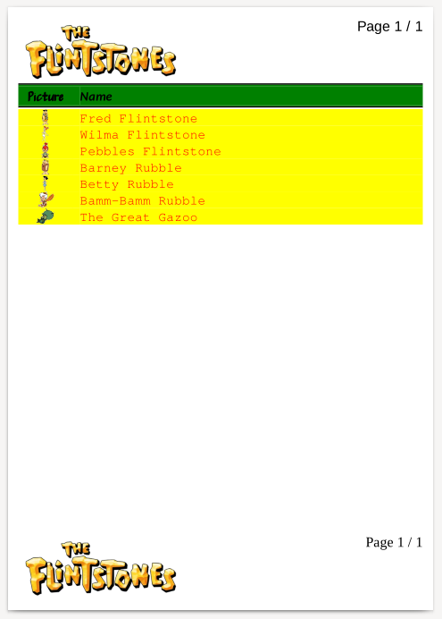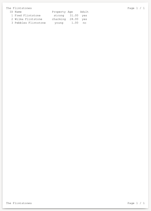 <?xml version="1.0"?> <!DOCTYPE OpenCReport SYSTEM "opencreport.dtd"> <OpenCReport> <Report query="q"> <PageHeader> <Output> <Line> <literal width="20">The Flintstones</literal> <field value="printf('Page %d / %d', r.pageno, r.totpages)" align="right" /> </Line> </Output> </PageHeader> <PageFooter> <Output> <Line> <literal>The Flintstones</literal> <field value="printf('Page %d / %d', r.pageno, r.totpages)" align="right" /> </Line> </Output> </PageFooter> <Detail> <FieldHeaders> <Output> <Line> <literal width="4" align="'right'">ID</literal> <literal width="1"/> <literal width="20">Name</literal> <literal width="1"/> <literal width="8" align="'center'">Property</literal> <literal width="1"/> <literal width="6">Age</literal> <literal width="1"/> <literal width="5" align="'center'">Adult</literal> </Line> </Output> </FieldHeaders> <FieldDetails> <Output> <Line> <field width="4" align="right" value="id" /> <literal width="1"/> <field width="20" value="name" /> <literal width="1"/> <field width="8" align="'center'" value="property" /> <literal width="1"/> <field width="6" align="'right'" value="age" format="'%.2d'" /> <literal width="1"/> <field value="adult ? 'yes' : 'no'" width="5" align="'center'"/> </Line> </Output> </FieldDetails> </Detail> </Report> </OpenCReport>
