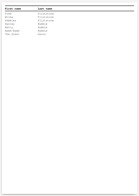 <?xml version="1.0"?> <!DOCTYPE OpenCReport SYSTEM "opencreport.dtd"> <OpenCReport> <Report query="q1"> <Detail> <FieldHeaders> <Output> <HorizontalLine size="2" color="'black'" /> <HorizontalLine size="2" color="'white'" /> <Line bold="yes"> <literal width="20">First name</literal> <literal width="20">Last name</literal> </Line> <HorizontalLine size="2" color="'white'" /> <HorizontalLine size="2" color="'black'" /> <HorizontalLine size="2" color="'white'" /> </Output> </FieldHeaders> <FieldDetails> <Output> <Line> <field width="20" value="q1.firstname" /> <field width="20" value="q2.lastname" /> </Line> </Output> </FieldDetails> </Detail> </Report> </OpenCReport>