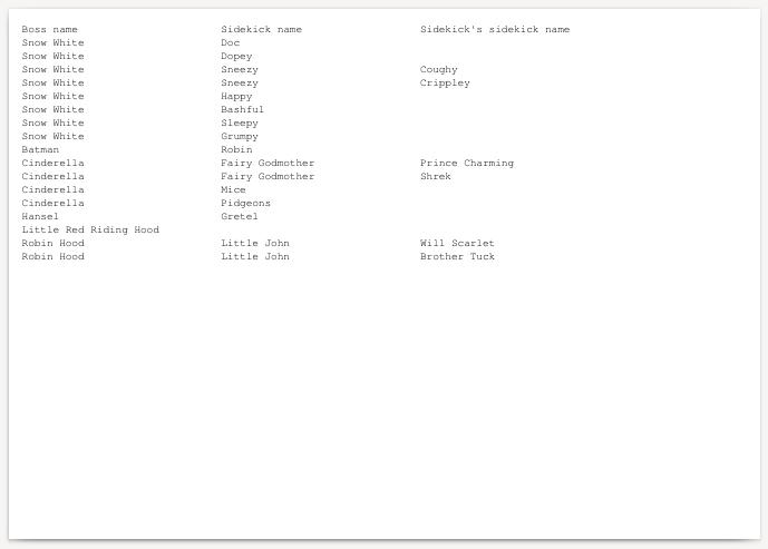 <?xml version="1.0"?> <!DOCTYPE report > <OpenCReport> <Report orientation="landscape"> <Detail> <FieldHeaders> <Output> <Line> <literal width="30">Boss name</literal> <literal width="1"/> <literal width="30">Sidekick name</literal> <literal width="1"/> <literal width="30">Sidekick's sidekick name</literal> </Line> </Output> </FieldHeaders> <FieldDetails> <Output> <Line> <field value="q1.name" width="30" align="left" /> <literal width="1"/> <field value="q2.name" width="30" align="left" /> <literal width="1"/> <field value="q3.name" width="30" align="left" /> </Line> </Output> </FieldDetails> </Detail> </Report> </OpenCReport>