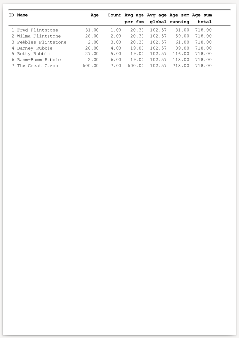 <?xml version="1.0"?> <!DOCTYPE OpenCReport SYSTEM "opencreport.dtd"> <OpenCReport> <Report query="q"> <Variables> <Variable name="var1" value="id" type="count" /> <Variable name="var2" value="age" type="average" precalculate="yes" resetonbreak="family" /> <Variable name="var3" value="age" type="average" precalculate="yes" /> <Variable name="var4" value="age" type="sum" /> <Variable name="var5" value="age" type="sum" precalculate="yes" /> </Variables> <Breaks> <Break name="family"> <BreakFields> <BreakField value="lastname" /> </BreakFields> </Break> </Breaks> <Detail> <FieldHeaders> <Output> <HorizontalLine size="2" color="'black'" /> <HorizontalLine size="2" color="'white'" /> <Line bold="yes"> <literal width="2" align="'center'">ID</literal> <literal width="1"/> <literal width="20">Name</literal> <literal width="1"/> <literal width="8" align="'right'">Age</literal> <literal width="8" align="'right'">Count</literal> <literal width="8" align="'right'">Avg age</literal> <literal width="8" align="'right'">Avg age</literal> <literal width="8" align="'right'">Age sum</literal> <literal width="8" align="'right'">Age sum</literal> </Line> <Line bold="yes"> <literal width="2"/> <literal width="1"/> <literal width="20"/> <literal width="1"/> <literal width="8"/> <literal width="8"/> <literal width="8" align="'right'">per fam</literal> <literal width="8" align="'right'">global</literal> <literal width="8" align="'right'">running</literal> <literal width="8" align="'right'">total</literal> </Line> <HorizontalLine size="2" color="'white'" /> <HorizontalLine size="2" color="'black'" /> <HorizontalLine size="2" color="'white'" /> </Output> </FieldHeaders> <FieldDetails> <Output> <Line> <field width="2" align="'right'" value="id" /> <literal width="1" /> <field width="20" value="firstname + ' ' + lastname" /> <literal width="1"/> <field width="8" value="age" format="'%.2d'" align="'right'" /> <field width="8" value="v.var1" format="'%.2d'" align="'right'" /> <field width="8" value="v.var2" format="'%.2d'" align="'right'" /> <field width="8" value="v.var3" format="'%.2d'" align="'right'" /> <field width="8" value="v.var4" format="'%.2d'" align="'right'" /> <field width="8" value="v.var5" format="'%.2d'" align="'right'" /> </Line> </Output> </FieldDetails> </Detail> </Report> </OpenCReport>